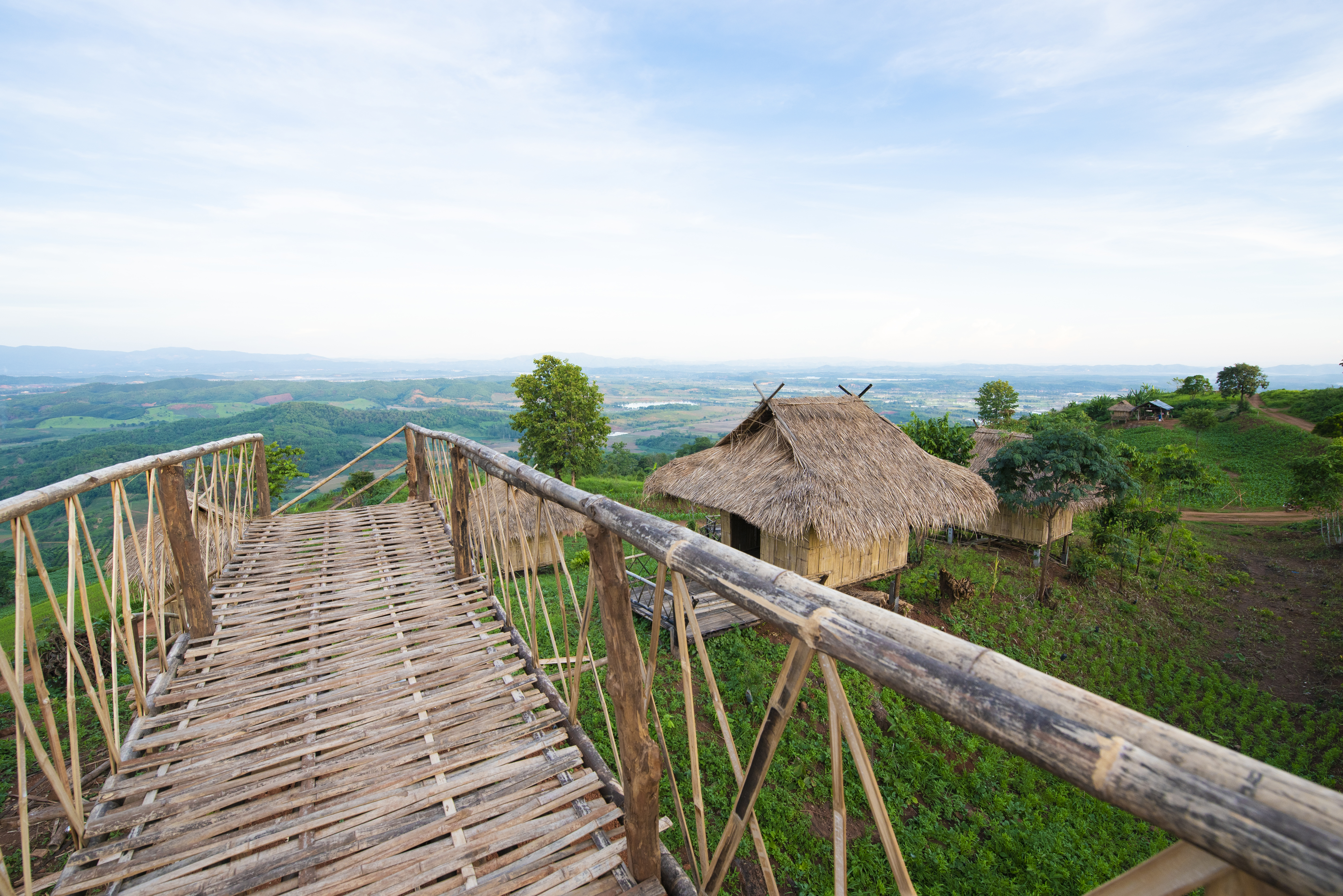 Bamboo Bridge Hut Mountain With Blue Sky