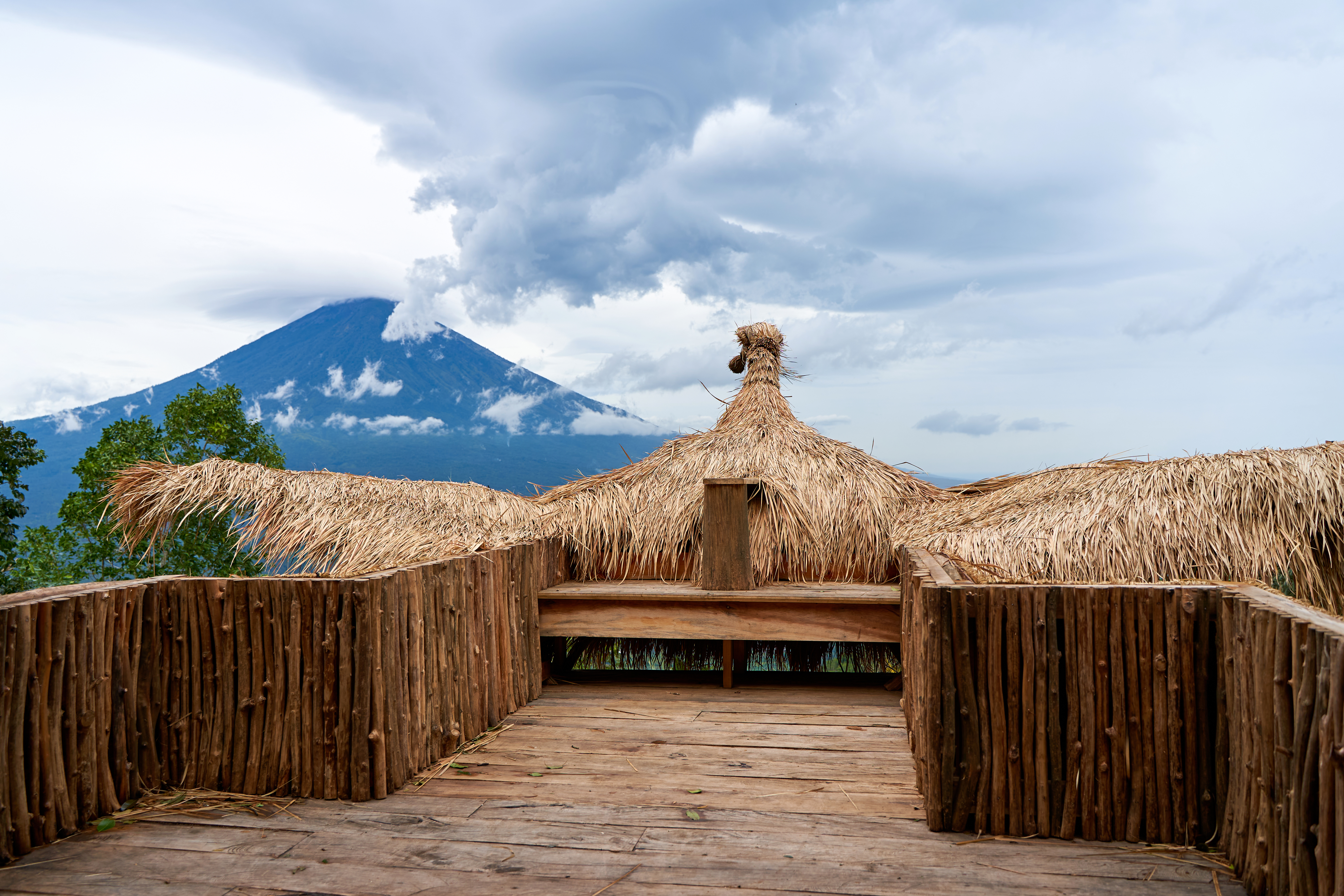 Large Straw Photo Zone Bird Viewpoint Overlooking Sacred Volcano Agung Hidden By Clouds Rainy Day Island Bali