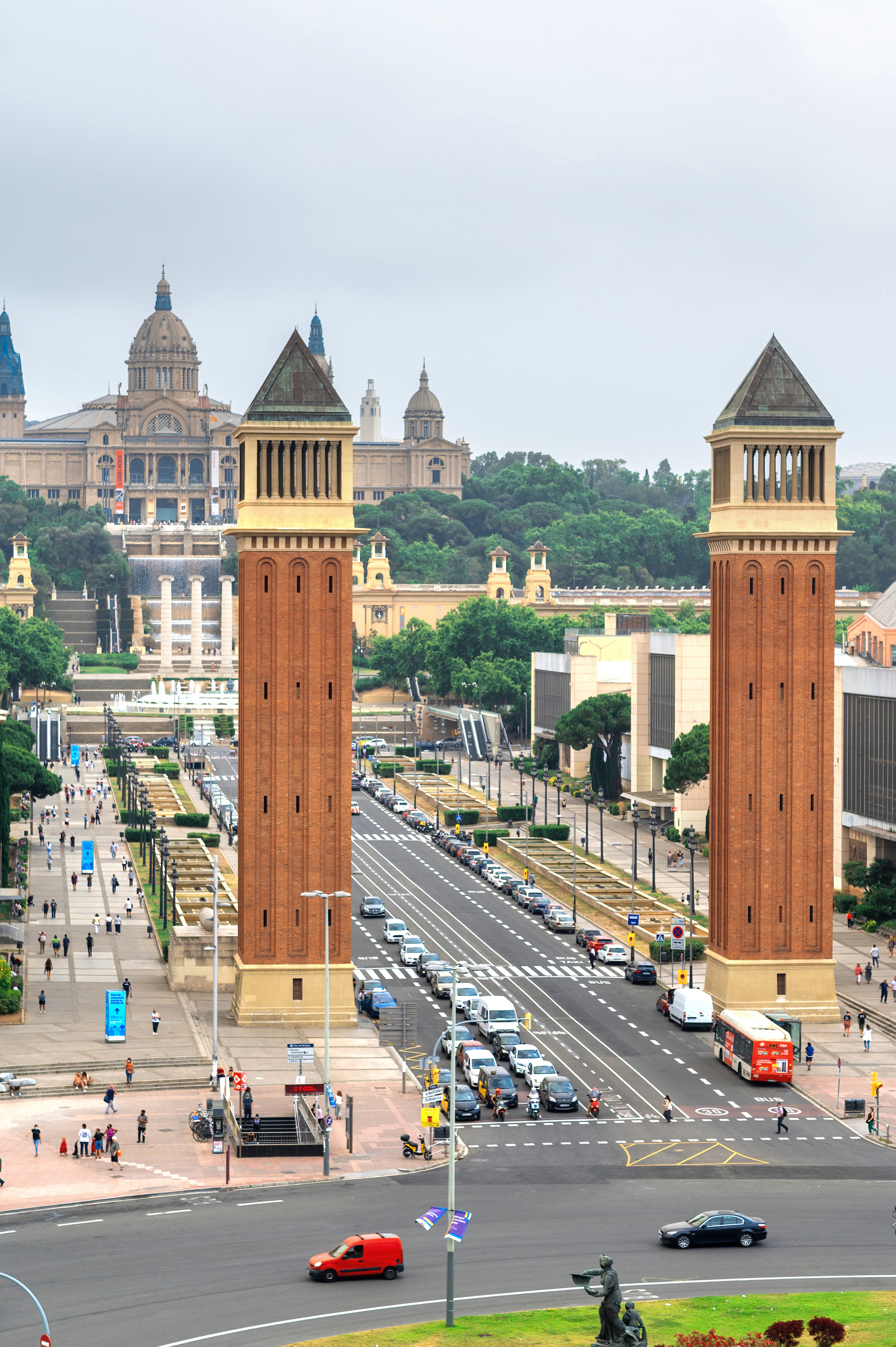 Plaza De Espana Venetian Towers Palau Nacional Barcelona Spain Cloudy Sky Traffic