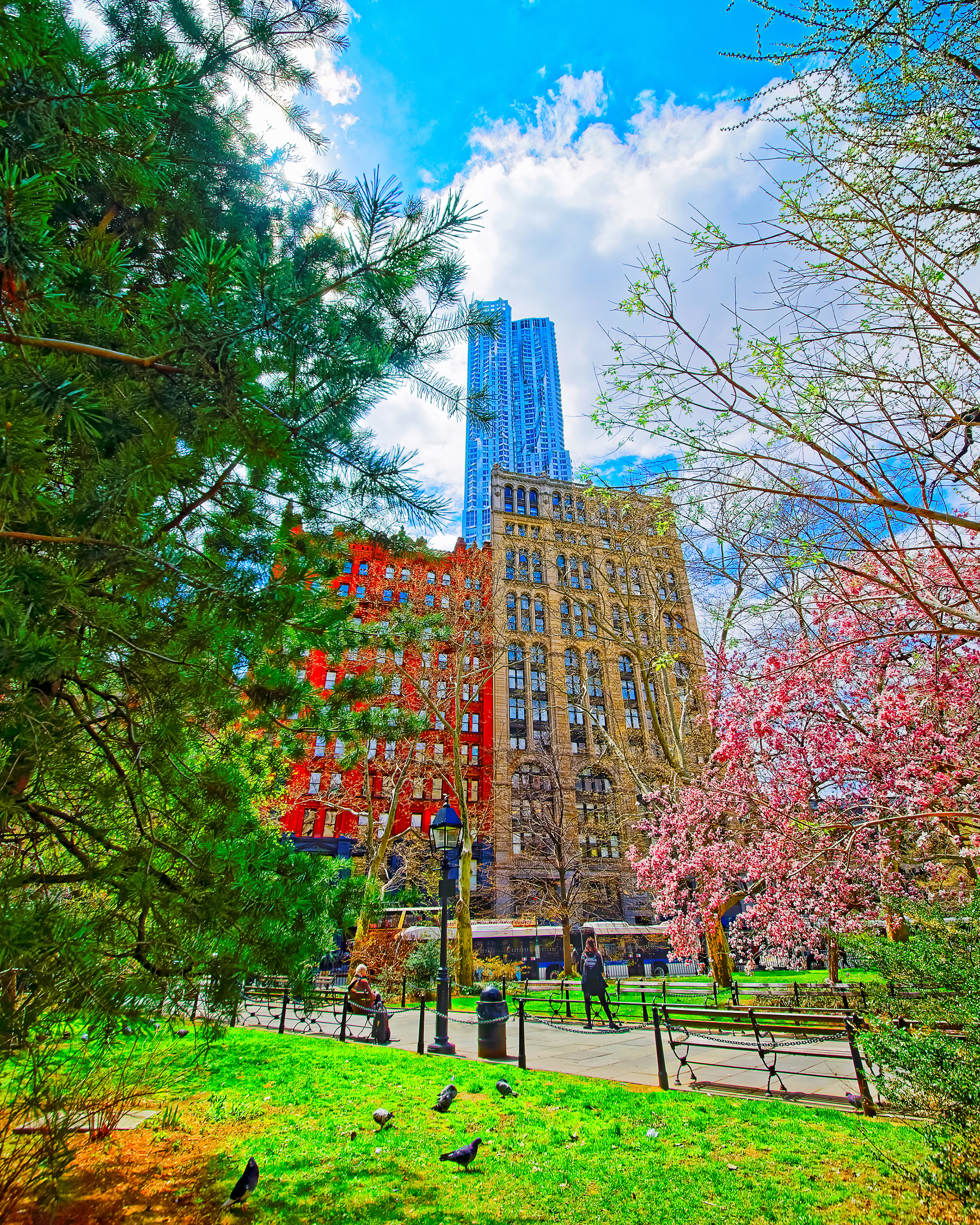Magnolia Trees Blossom City Hall Park Lower Manhattan New York Usa View With Skyline Skyscrapers Architecture Nyc Nature Background Urban Cityscape Ny Us